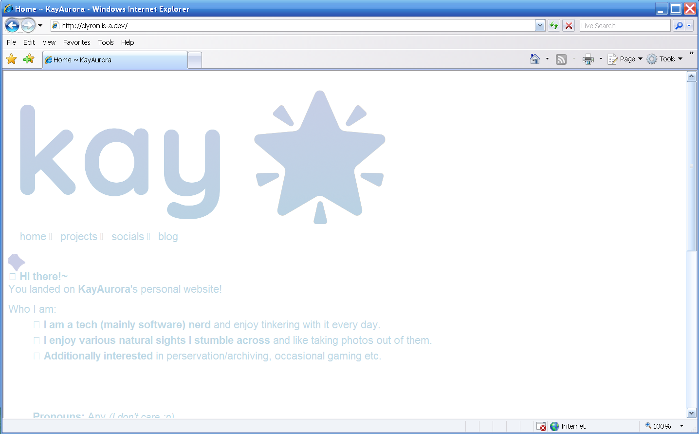 For this phase I decided to set up a VM with Windows XP MCE 2005 (I usually do Professional but decided to try something different), which came with Internet Explorer 7 out of the box. Here’s v3.0 of this website on IE7: