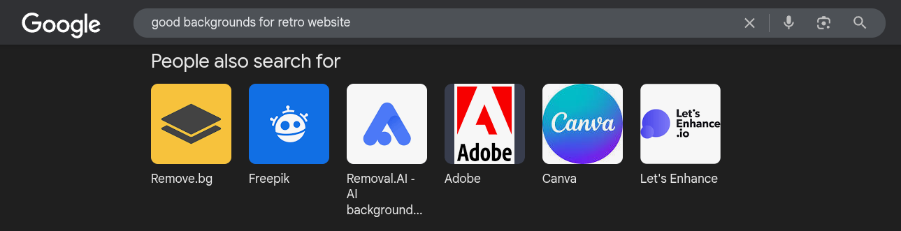 Most of the search results were """retro backgrounds""" sourced from stock image providers that have literally have nothing to do with what I’m searching for! And y’know what’s the most hilarious part? The “People also search for” checkbox: